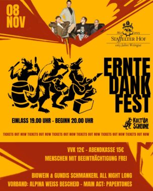 Die Weinlese 2025 neigt sich dem Ende zu – höchste Zeit, die Ernte gemeinsam zu feiern! Am Samstag, 08. November 2025 lädt der Staffelter Hof wieder zu seinem traditionellen ErnteDankFest ein.